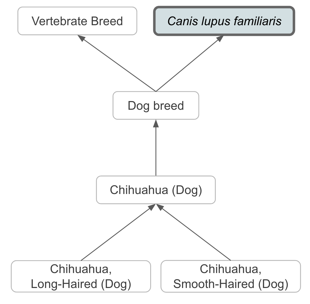 Distinguishable sub-breeds, strains, or varieties are also included in VBO and are related to the ontological parent breed using an is_a relation. For example, 'Chihuahua, Long-Haired (Dog)' (VBO:0200339) and 'Chihuahua, Smooth-Haired (Dog)' (VBO:0200340) are subclasses of 'Chihuahua (Dog)' (VBO:0200338).