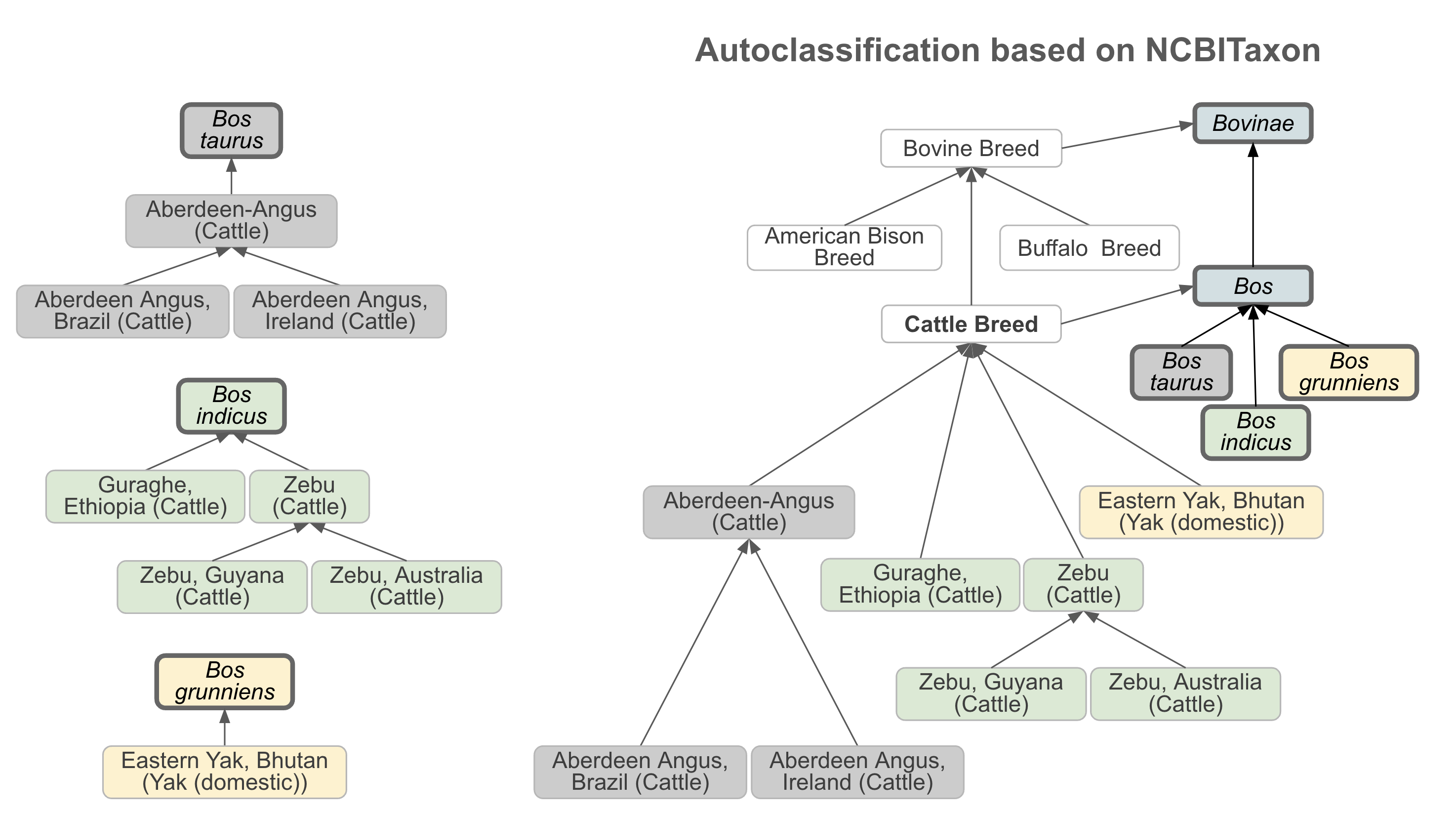 Example: ‘Cattle breed’ (VBO:0400020) is defined as: ‘Vertebrate breed’ and Bos (NCBITaxon:9903). Bos indicus (zebu cattle, NCBITaxon:9915), Bos taurus (cattle, NCBITaxon:9913), Bos indicus × Bos taurus (hybrid cattle, NCBITaxon:30522), and Bos grunniens (yak, NCBITaxon:30521), are all autoclassified as ‘Cattle breed’ via the NCBITaxon hierarchy.