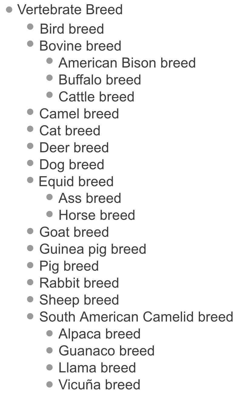 VBO breed terms are classified under the general term ‘Vertebrate breed’ (VBO:0400000) and grouped, for example, based on specific animal species (e.g., ‘Horse breed’) or animals of the same genus (‘Cattle breed’) based on community and expert usage and jargon.
